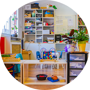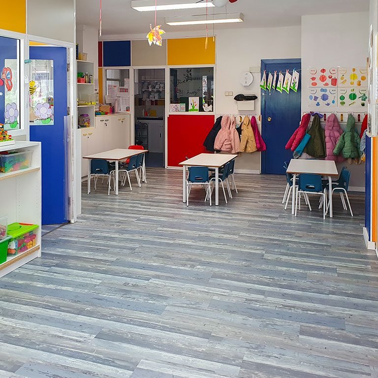Aulas muy espaciosas y luminosas. Los niños están separados por edades, pero prima la interacción de unos con otros como sistema de aprendizaje.